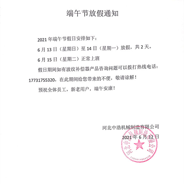 中浩膨脹節廠家2021年端午節放假通知-河北中浩機械制造有限公司