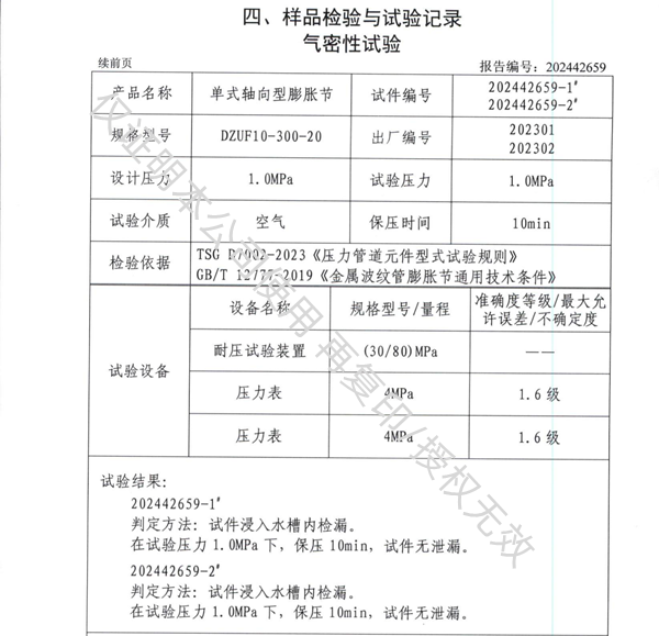 金屬波紋管(膨脹節)氣密性試驗 結論無泄漏